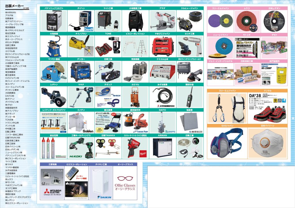 AIRMAN/アサダ/旭産業/アマダマシナリー/イーグル・クランプ/育良精機/イチネンケミカルズ/岩谷瓦斯/エスティジェイ/オーリーグラシス/おたふく手袋/加研工業/柏田製作所/カミマル/京セラインダストリアルツールズ/ケミカル山本/ケルヒャージャパン/小池酸素工業/工機ホールディングス/神戸製鋼所/埼玉精機/蔵王産業/GVSジャパン/ジェイ・インターナショナル/スイデン/スリーエムジャパン/ダイキン工業/大同興業/DAITO/ダイヘン/ダイワラビン/タセト/鶴見製作所/テクノプラン/テザック/デンヨー/TONE/トラスコ中山/ドンケル/中村鐵工/日動工業/ニツコー熔材工業/日酸TANAKA/日鉄溶接工業/日東工器/日本バイリーン/日本レヂボン/ニューレジストン/パナソニックコネクト/ピカコーポレイション/マイト工業/マキタ/マツモト機械/みずほ産業/三菱電機/ミルウォーキーツール・ジャパン/ムラコ/モトユキ/やまびこジャパン/ヨコタ工業/理研オプテック/理研計器/レゾナック・ガスプロダクツ/レヂトン/ロゴスコーポレーション